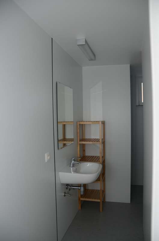 Gemeenschappelijke badkamer met wastafel, douche en hangtoilet