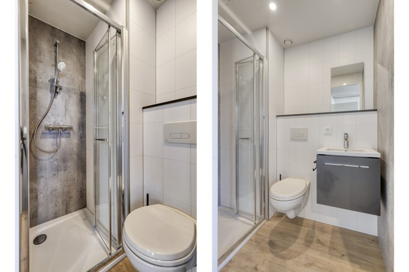 Why choose a student room at Amand 47? Each room is painted, equipped with the necessary lighting and a private bathroom (equipped with a shower, washbasin unit with sink and a wall-mounted toilet). In addition, there is a desk, a bed, a wardrobe and curtain rails.