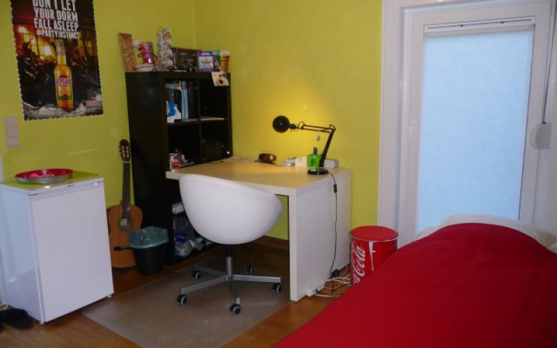 Kamer volledig bemeubeld met bed, bureau, bureaustoel, boekenrek, kleerkast en koelkast.