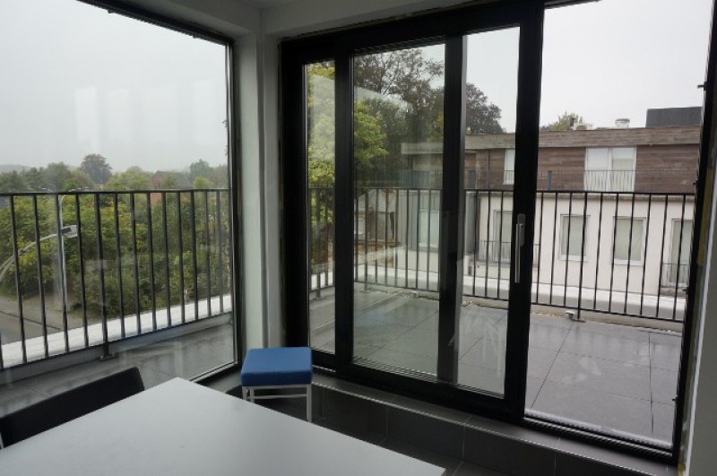 Zonnig gelegen! Terras en volledig uitgeruste gemeenschappelijke keuken op het bovenste verdiep van een Nieuw Kotencomplex van 8 kamers.